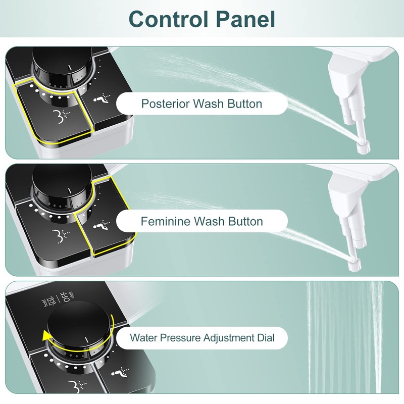 - Self-Cleaning & Pressure Control: Our bidet features an self-cleaning nozzle, combined with a user-friendly control dial to adjust water pressure. This ensures a fresh, cleaning feel every time, while the adjustable pressure caters to individual comfort needs—especially beneficial for those with mobility limitations.