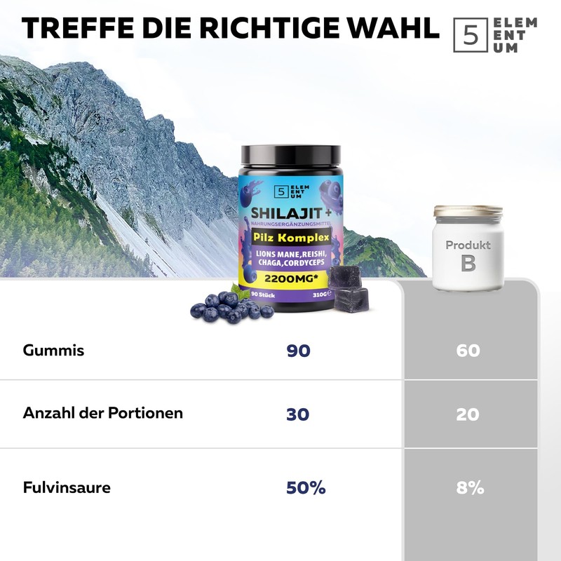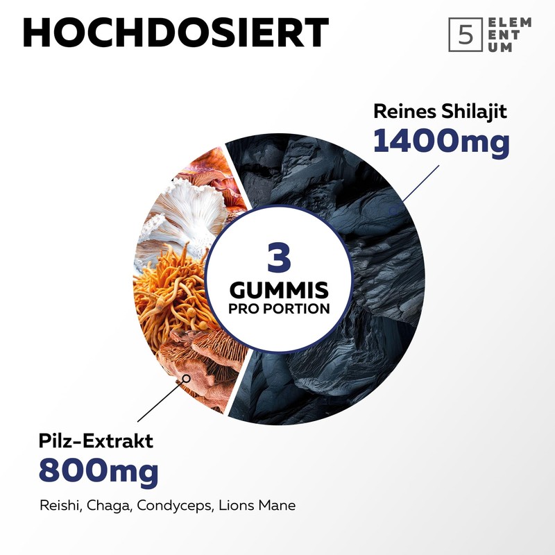 - Reinforced dosage for maximum effect: benefit from the benefits of an increased dose of 2200 mg pure Shilajit in combination with a strong mushroom complex.