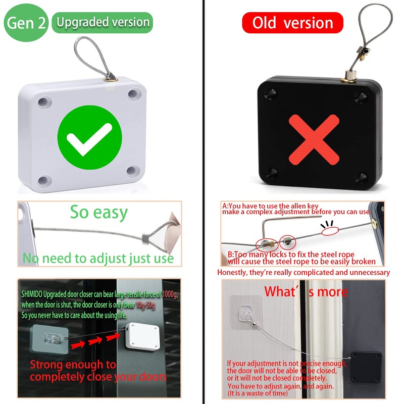 - 【The 2nd Generation】: 1: 800g up to 1000g. 2: Now you don’t have to adjust anymore. 3: Adopting upgraded double steel wire rope to make it more durable than others. 4: This 2nd Generation door closer, more convenient, more secure.