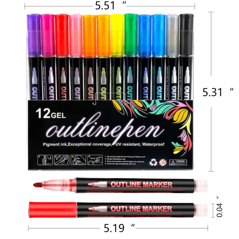 - PREMIUM SHIMMER MARKERS - Comes a vibrant set of 12 colors, featuring a double-line outline design for captivating dual-color effects. These versatile markers showcase their magic on light-colored paper, black paper, and smooth surfaces, opening up creative possibilities for unique art projects.