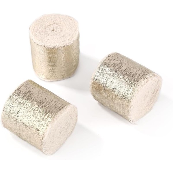 Shimmery Gold Silk Ribbon - 3 Rolls Chiffon Frayed Sparkling Glitter Fabric for Bridal Flower, Champagne