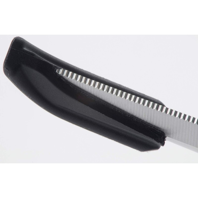 - Material: Blade: Stainless steel cutlery; Handle: ABS (acrylonitrile butadiene styrene) resin (heat resistant up to 176°F (80°C)), Blade guard: Nylon (heat resistant to 83°F/230°C)