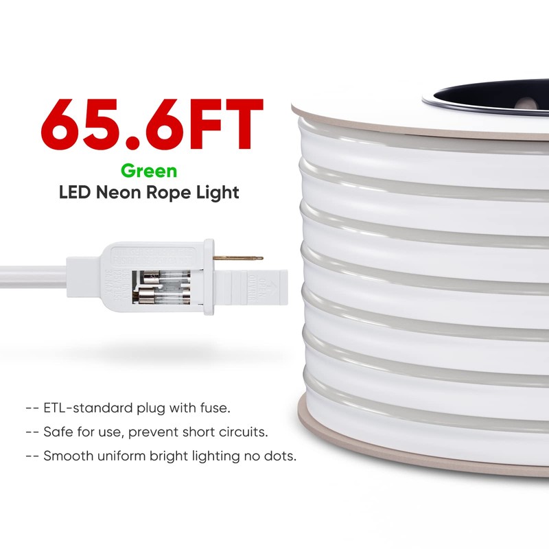 Shine Decor LED Rope Lights AC 120V, Connectable & Cuttable Dotless 120LEDs/M Eco Neon Strip Lighting, ETL IP65 Waterproof & Weather-Resistant for Home Commercial, 8x16mm, Green, 65.6FT