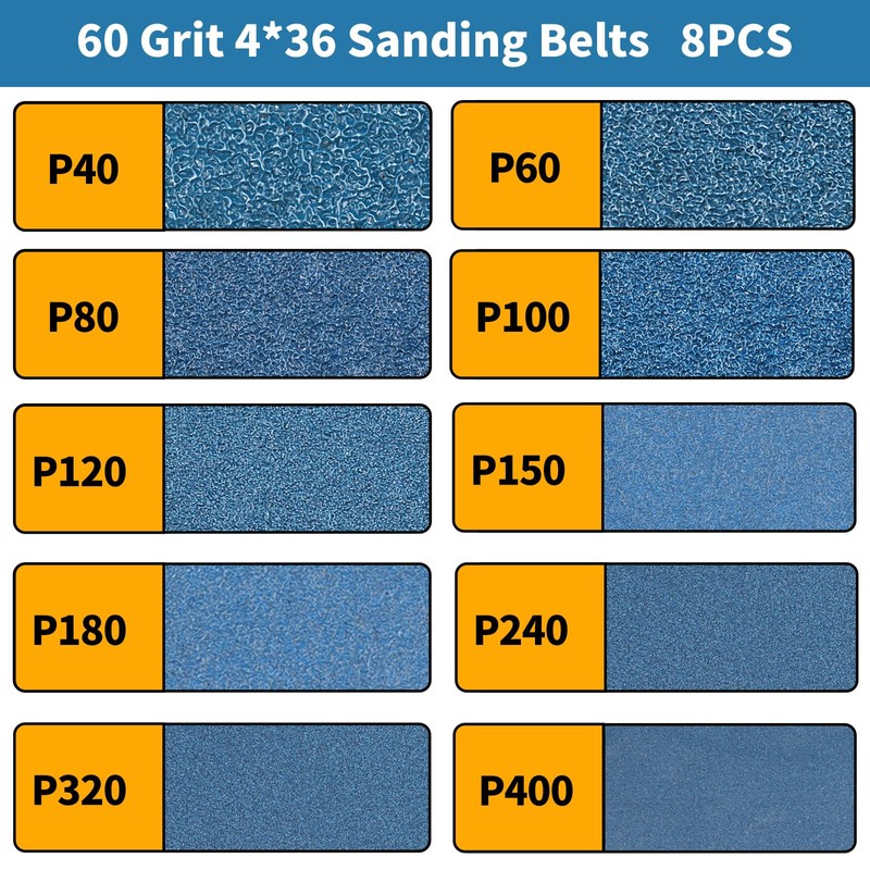 - PRODUCT SPECIFICATIONS: There are 10 different grits: 40, 60, 80, 100, 120, 150, 180, 240, 320, and 400. This item comes with 8pcs 4x36 Inch zirconia sanding belts, all of which are of 60 grit
