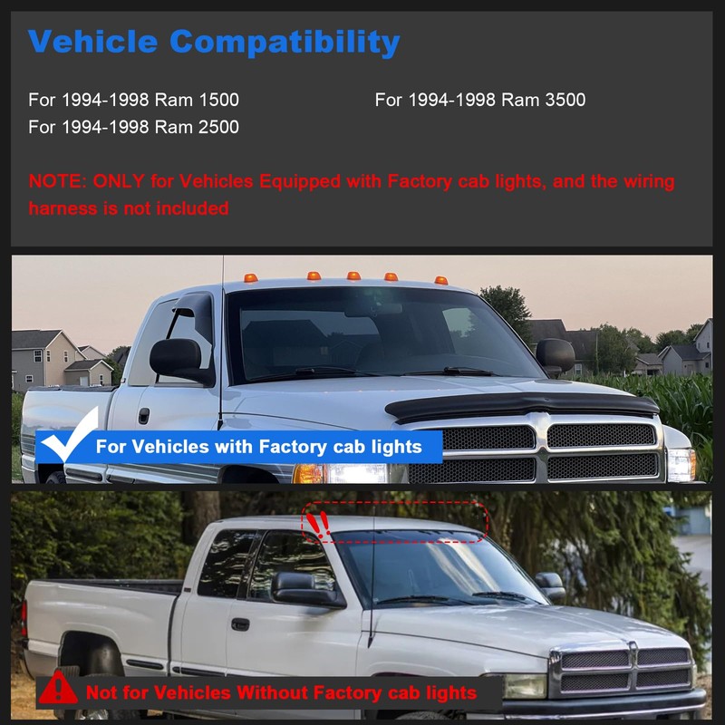 - Vehicle Compatibility - Legal on road, DOT/SAE approved. LED Cab Roof Light compatible with 1994-1998 Ram 1500 / 1994-1998 Ram 2500 / 1994-1998 Ram 3500 (NOTE: Replacement for Vehicles Equipped With Oem Cab Lights . Does not include wiring harness).