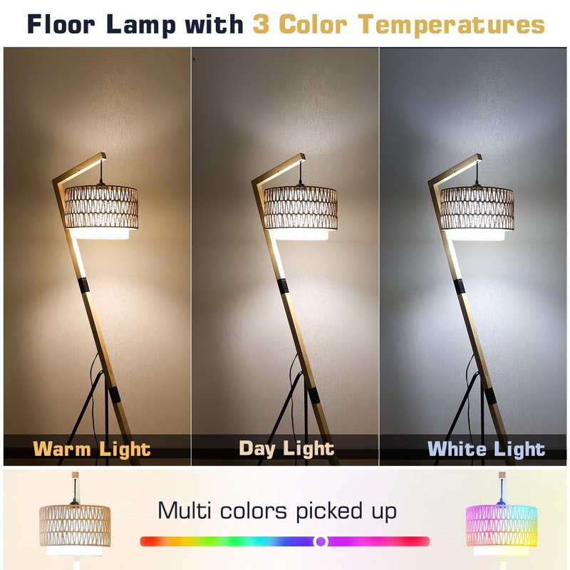 ShineMuse Wood Tripod Floor Lamp,Rattan and Fabric Lamp Shade Design,15W Dimmable RGB Bulb(LED) Included,Suit for Bedroom Living Room