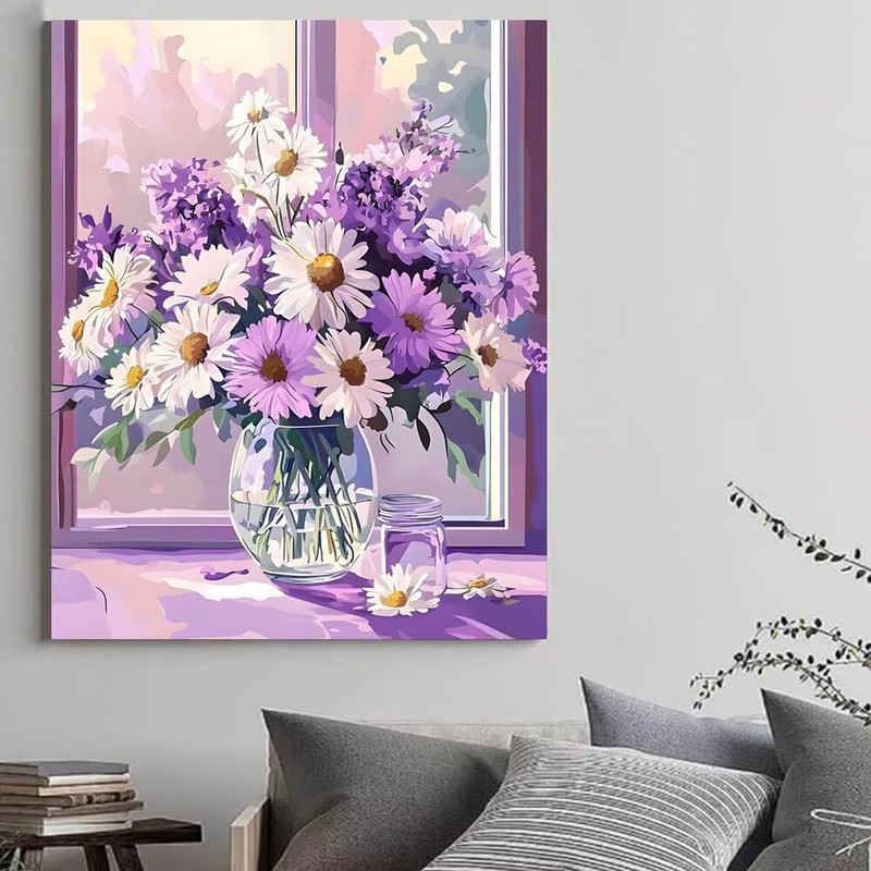 ShineSnow Daisy Purple White Flowers in Vase Art Acrylic Paint Adult Paint by Number Kits on Canvas 16x20 inch DIY Craft Kits for Adults Women Beginner Gifts Home Decoration