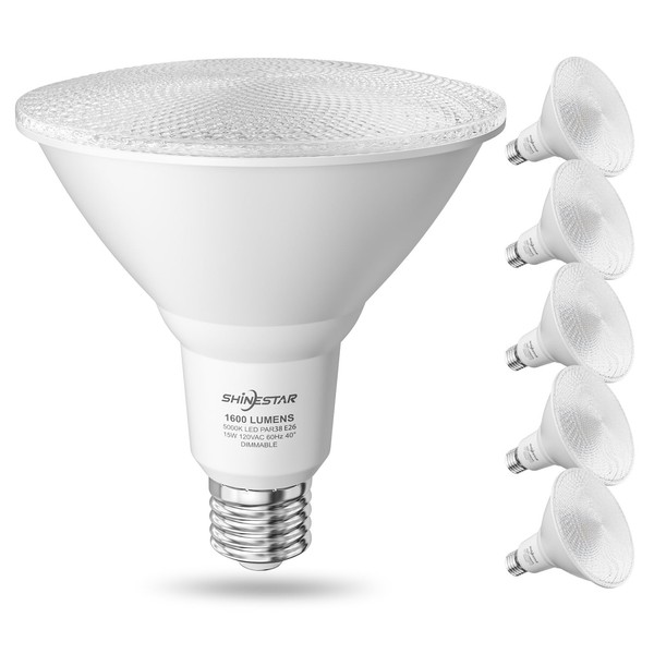 SHINESTAR 6-Pack Outdoor Flood Light Bulb, 15W (100W Equivalent), Dimmable PAR38 LED Bulb, 5000K Daylight, 1600LM, E26 Base