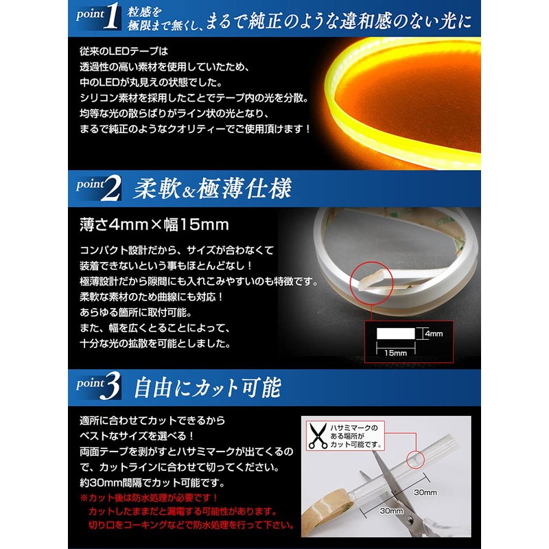- [No grain sensation and no discomfort like the original] The conventional LED tape was made of highly transparent material, so the LED inside was completely visible. This product uses silicone material to disperse the light inside the tape. Even light scatter creates a line of light, giving you the same quality as the original. In addition, the compact design is 0.2 x 0.6 inches (4 x 15 mm), so there is almost no chance to put it on because of the size of the product does not fit. The ultra-thin design makes it easy to insert into gaps. Flexible material conforms to curves and can be mounted in any position. Wider width allows for sufficient light diffusion. A flowing turn signal with a symmetrical design that focuses on quality