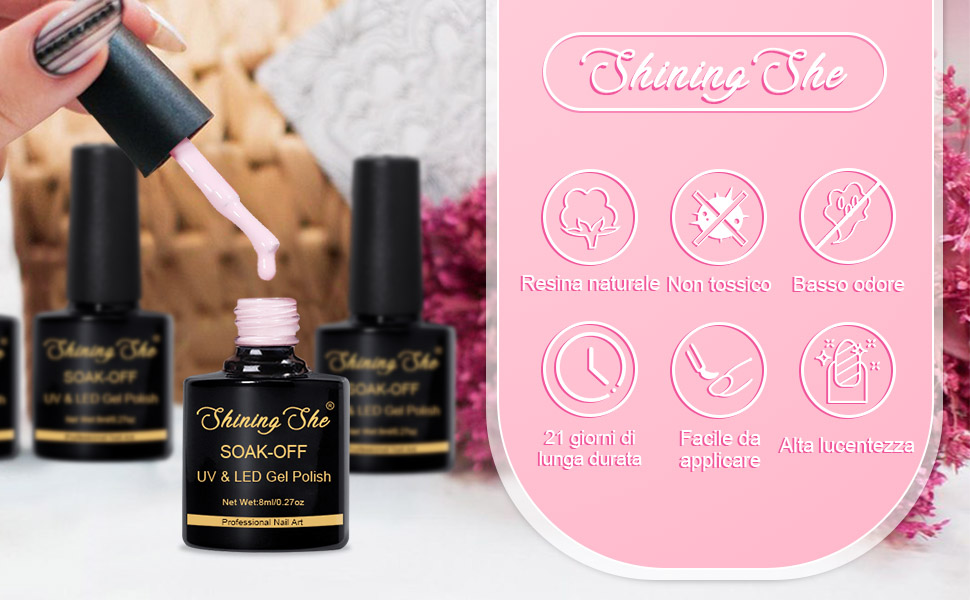 - Natural Material: Shining She semi-permanent nail gel is made of 100% natural resin, healthy, friendly, safe, non-toxic and low odor, does not harm your nails and skin, and can be used with confidence.