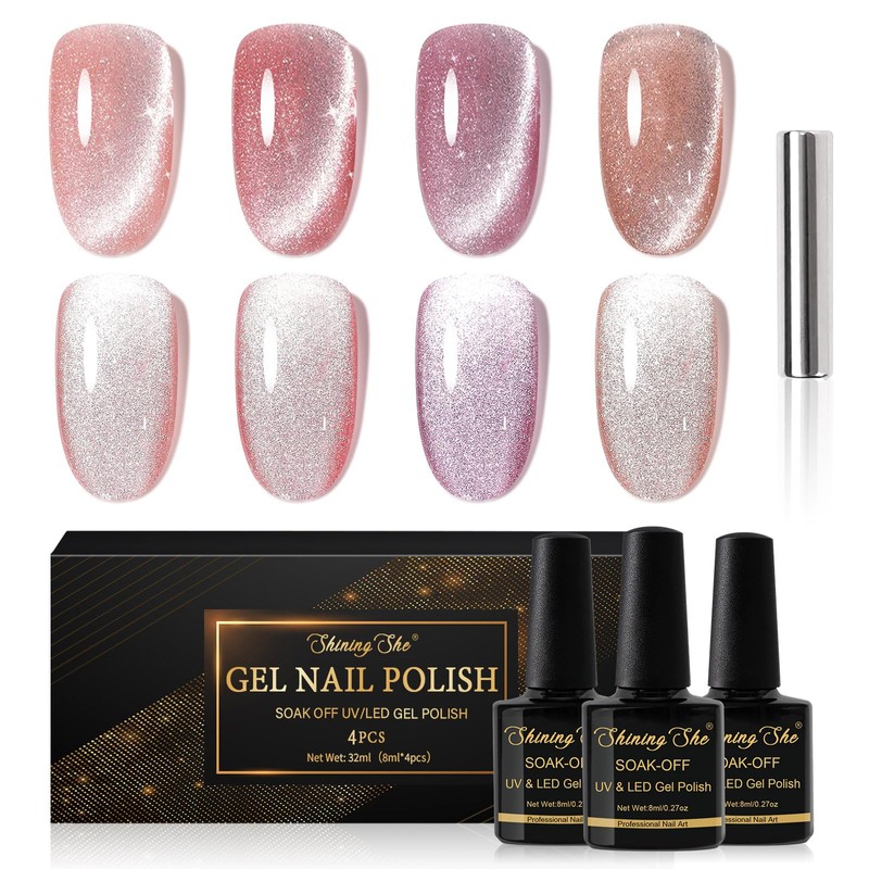 Shining She Shining She Cat Eye Gel Nail Polish, 4 Colours Jelly Nude Pink Rose Gold Magnetic Nail Polish with Magnet Soak-Off UV/LED Holographic Cat Eye Gel Polish for Nail Art Salon DIY Home, 8ML