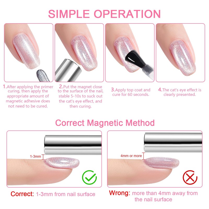 - Sparkling Holographic Effect:The magnetic powder is slowly moved from the edge of the nail to the desired pattern using a magnetic strip and then cured immediately. 60-90 secs for LED lamps and 2-4 mins for UV lamps.