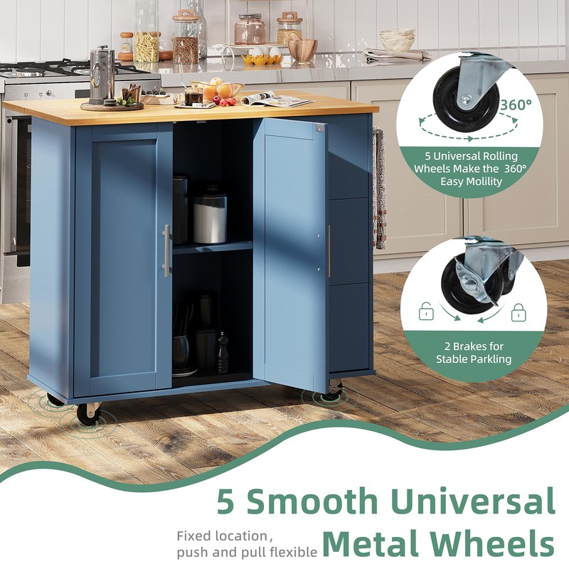 Shintenchi Rolling Kitchen Island Cart with Folding Drop Leaf Breakfast Bar, Portable Trolley Island with Large Storage Cabinet, Shelf and Drawer, Blue