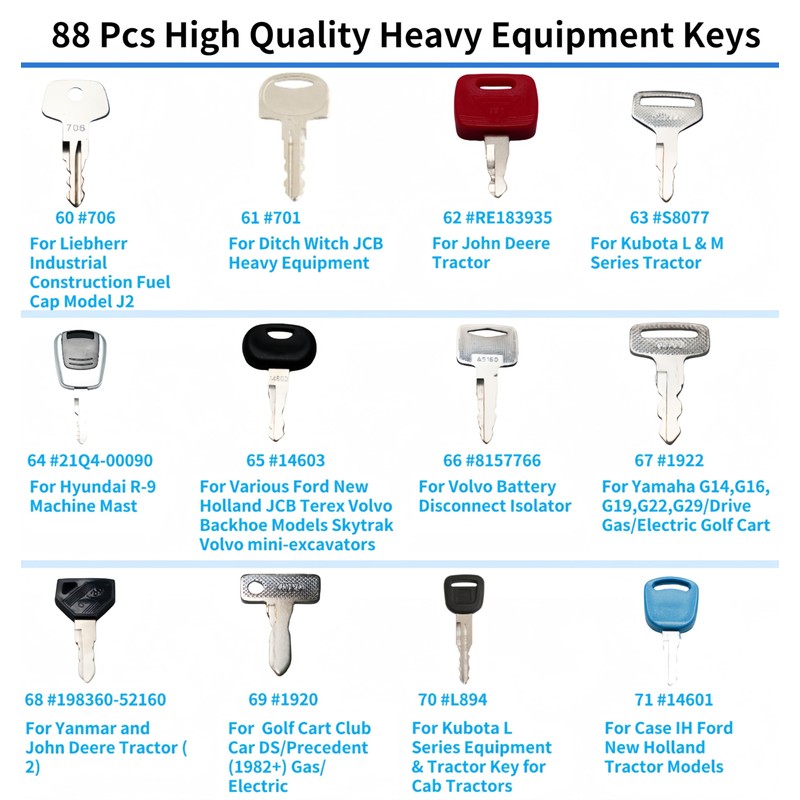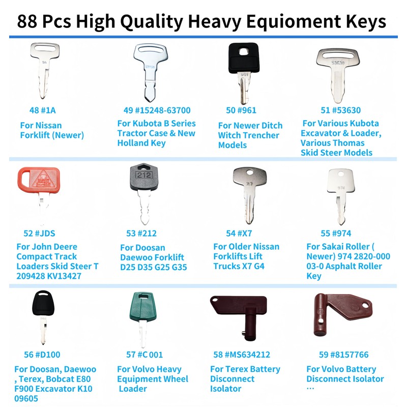 - 1.88 Heavy Construction Equipment Machine Operator Ignition Master Keys Set Fits Caterpillar Komatsu Toyota Hitachi Bobcat JD Case JLG JCB Yanmar Takeuchi Kubota Volvo Hyster Ford New Holland