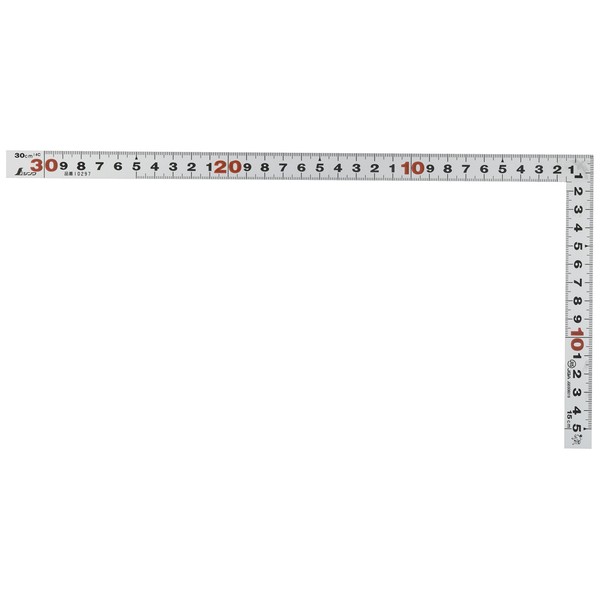 - Back scale; Long branch: Outer scale: 11.8 inches (30 cm), Inner scale: 9.8 inches (25 cm); Short branch: Outside scale: 5.9 inches (15 cm), Inner scale: 3.9 inches (10 cm); JIS mark; Red numbers; Shape: Same thick; Material: Stainless steel