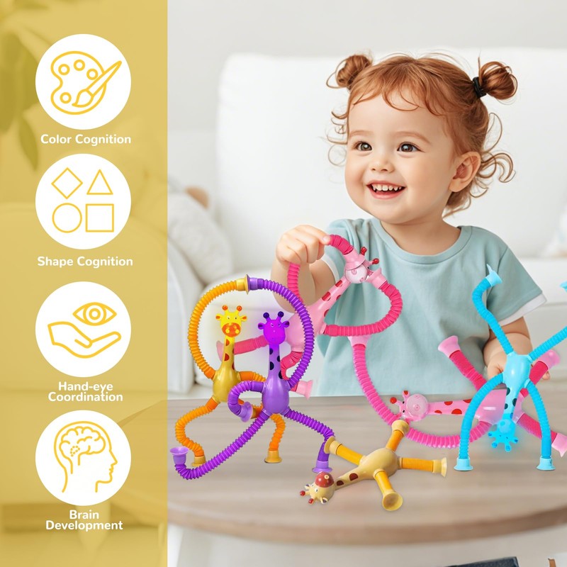 - Multifunctional adhesion technique: the limbs of the telescopic suction cup giraffe are equipped with suction cups that can be sucked on any smooth surface, allowing children to play in a variety of environments, allowing them to use their imagination and practical skills to make all sorts of novel things. (Small tip: with a little water, the suction cup becomes firmer)
