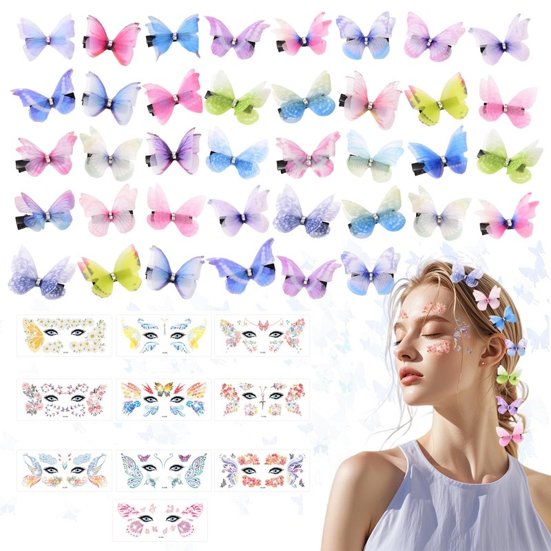 - Package includes: a total of 38 glitter butterfly clips in one pack and 10 pieces butterfly face stickers that you can choose according to your different outfits. Enough for your daily use and create your own fashionable looks.
