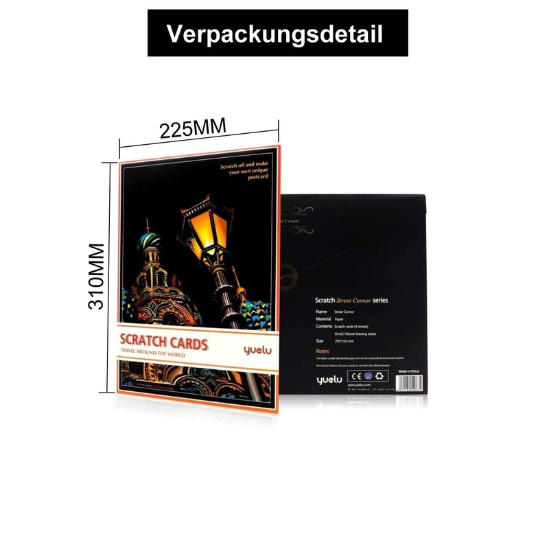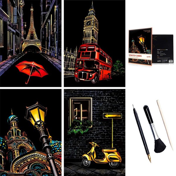 ShipeeKin 4 x Scratch Pictures, 290 x 210 mm, Street Corner of the City Wall Picture, Coated Colourful Scratch Paper with Tool Set (Street Corner)