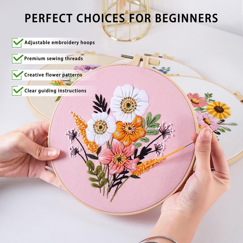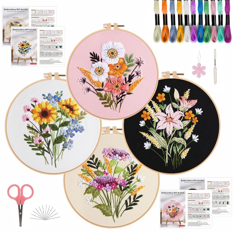 - All Included: You will receive 4 pre-printed pattern fabrics, 2 round embroidery hoops, a pair of scissors, 1 flower needle threader, a seam ripper, 4 instructions and 12 sewing needles.