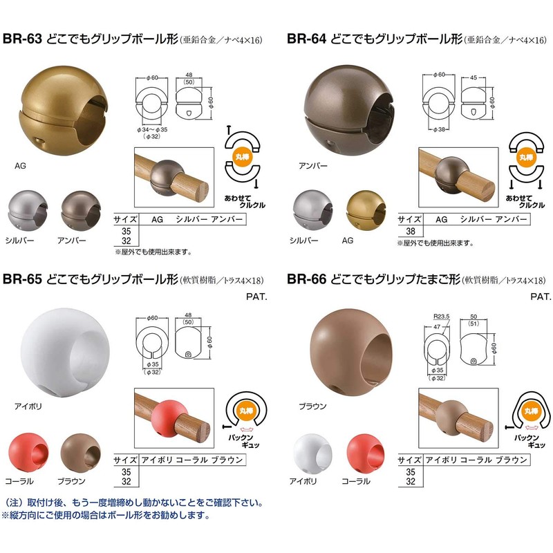SHIROKUMA BR-65 Handrail Auxiliary Grip Anywhere Grip, Ball Type, Brown, For Diameter 1.4 inches (35 mm)