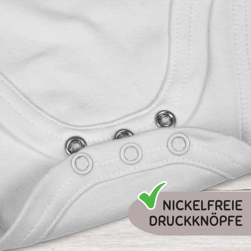 The baby bodysuit is made from 100% combed and ring-spun organic cotton. Thanks to an envelope neckline and the soft, elastic fabric, the baby romper is particularly comfortable and allows maximum freedom of movement. The tone-on-tone press studs complete the picture wonderfully. The buttons are nickel-free and completely harmless to health. So it can be chewed on it. A long-sleeved romper is absolutely necessary in cold times and with the matching motif also an unbeatable gift.