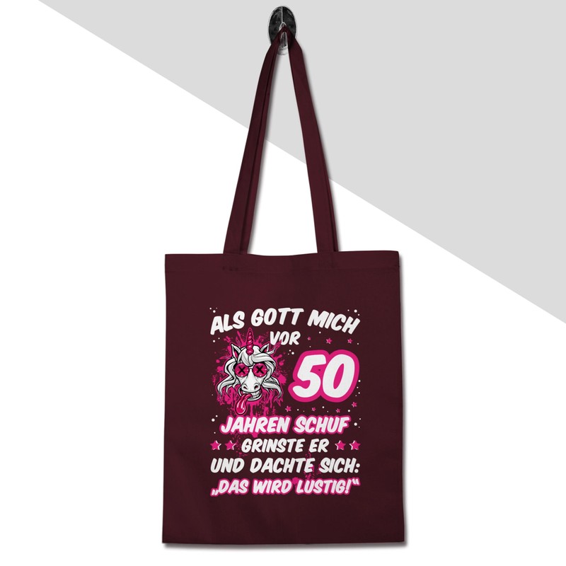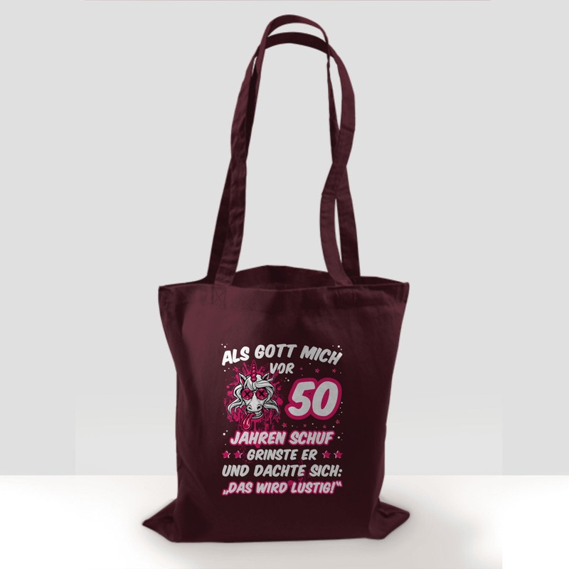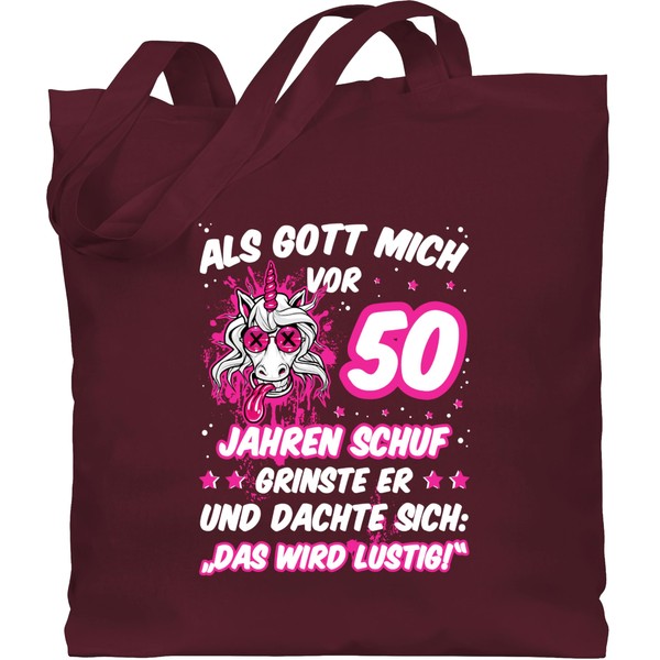 Shirtracer - Cotton Bag - 50th Birthday - When God Created Me 50 Years Ago He Grinned - Crazy Funny Unicorn, 5 Bordeaux red, Unit size