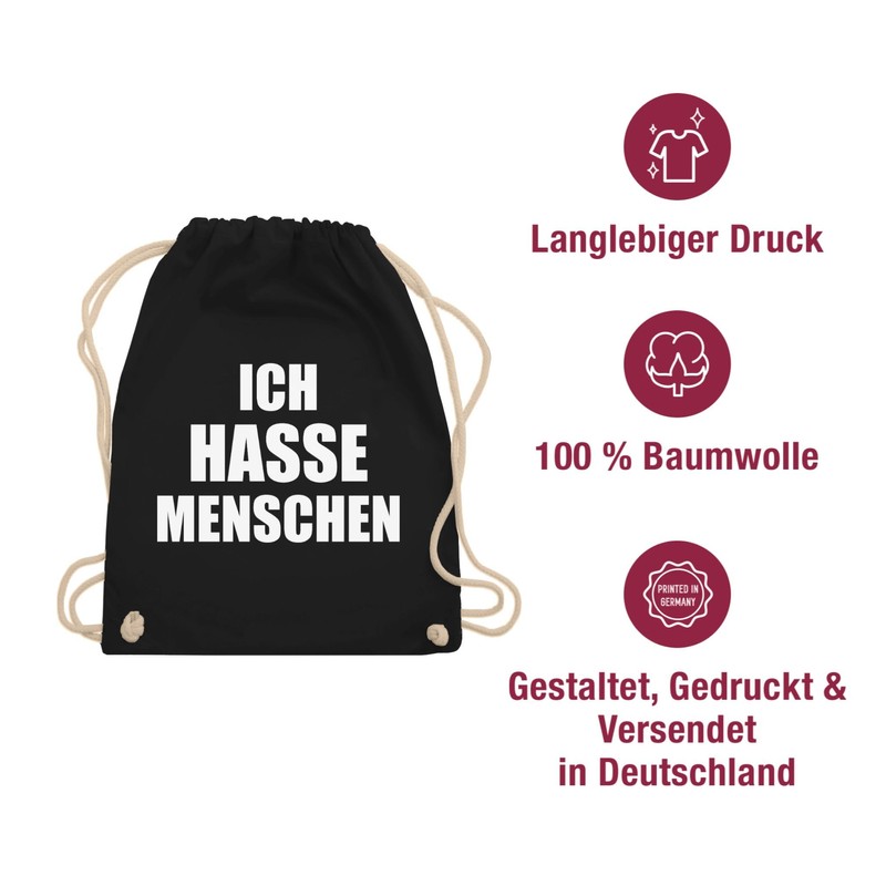 Shirtracer - Statement with saying - Ich hasse Menschen - gym bag and fabric bag made of cotton, 1 black, Einheitsgröße