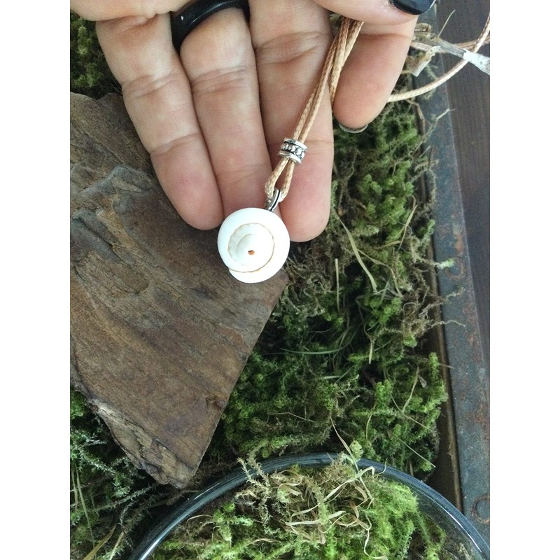 Dieses handgemachte Halsband besteht aus einem beigen Baumwollband in Schlangenlederoptik und einer wunderschönen naturfarbenen Shiva Muschel, die aud einem gehämmerten Anhänger befestigt wurde sowie einem verzierten Spacer aus Metall. Das Band wird mit zwei verschiebbaren Knoten in deiner Wunschlänge getragen, die maximale Länge beträgt 68 cm (bei Frauen etwa Brusthöhe) die minimale 34 cm, wobei die Knoten dann direkt neben der Muschel wären. Ein einfaches und naturverbundenes Halsband, für Strand- Wasser- oder Surf-Liebhaber, unisex.... Das Halsband wird mit einem Organzabeutel geliefert und ist somit auch als Geschenkartikel geeignet. Länge max. : 68 cm, minimal 34 cm, Muschel: ca. 2 cm.