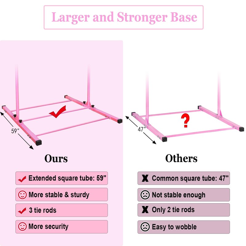 - STRONG & STABLE:SHIWEI Gymnastics Bar is Made of Heavy Duty Material. It Is Well-constructed with Durable Stainless Steel Arm (in 1.5mm thickness) and Steel Base Tube (as thick as 2.0mm). The Specially-designed Double Locking Mechanism Make Sure Kip Bar is Locked Safely which Also Gives Gymnastic Bar Extra Stability.
