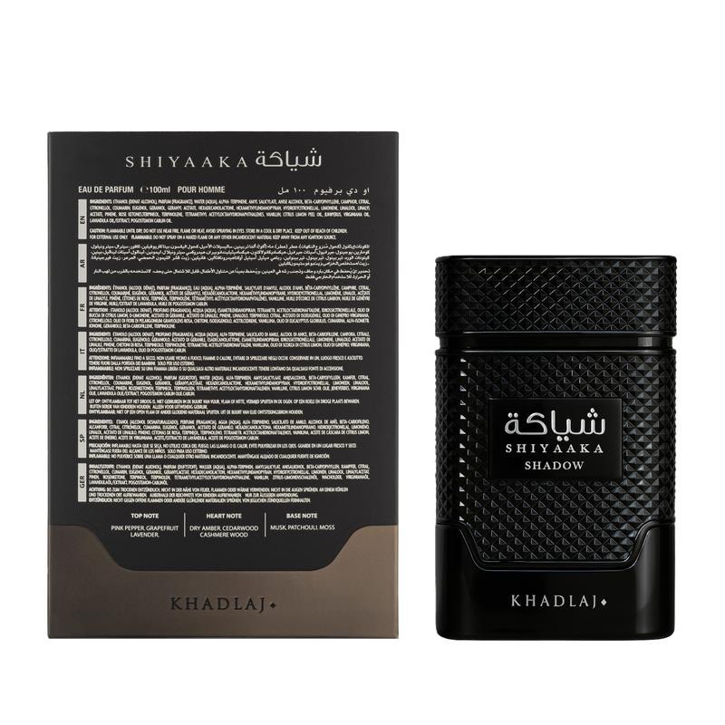 Experience the sophisticated allure of Khadlaj Shiyaaka Shadow Eau de Parfum (3.4 Oz / 100ml). This unisex fragrance opens with a fresh and vibrant blend of pink pepper, grapefruit, and lavender. The heart notes of dry amber, cedarwood, and cashmere wood add warmth and complexity, while the base of musk, patchouli, moss, and truffle delivers a rich, long-lasting finish. Designed for those who appreciate a refined, balanced scent, Shiyaaka Shadow is ideal for everyday wear or making a memorable impression on special occasions. A versatile addition to any fragrance collection, this perfume embodies elegance and sophistication.