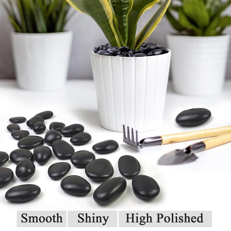- 【Wide Range Of Use Scenarios】: Black high polished pebbles can be used for indoor and outdoor home decoration, can be used to decorate vases, fish tanks, also very good outdoor fountain decoration. These stones are very suitable and beautiful for decorating the front lawn and yard of your home. Smooth and rounded stones will not scratch your feet, and they are perfect for garden paving.