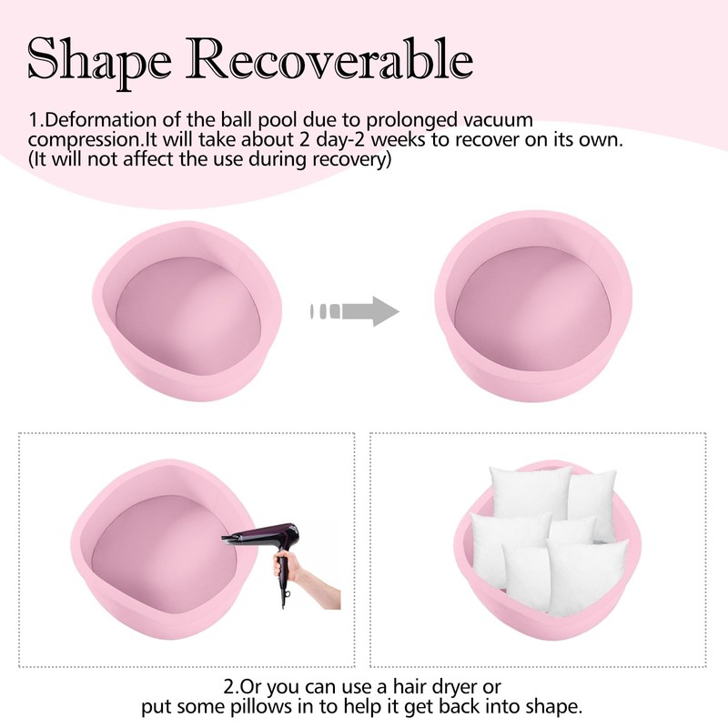 - [Vacuum-sealed Design]The kiddie ball pit is vacuum-sealed. When you open the sponge, it will expand immediately, but it will not show a perfect circle immediately. It can be placed for 2days-3weeks to wait for it to recover. A hairdryer with moderate temperature or stuff the empty ball pit with pillows and blankets will help a lot to shape recovery.(the recovery process will not affect the use).