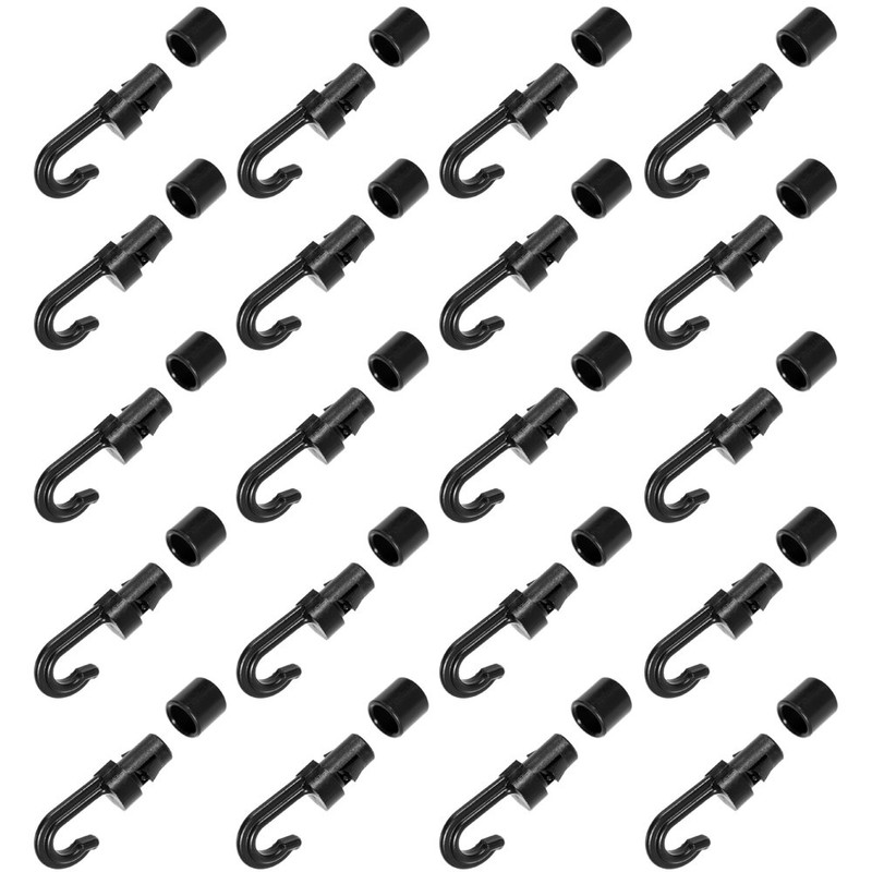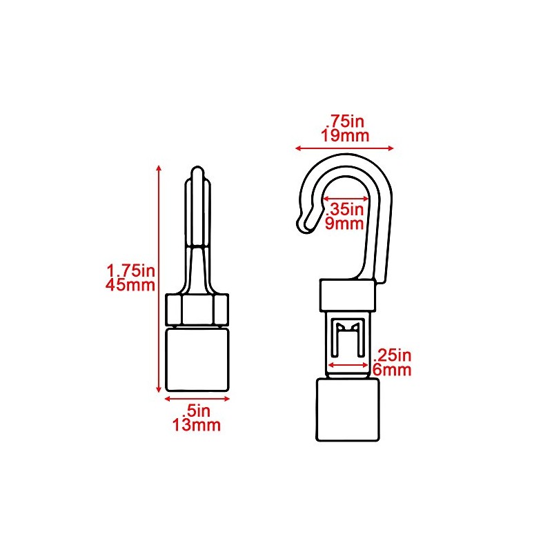 - AVAILABILITY: Our flat, open end, plastic bungee hooks are available in black, and in pack size options of 4, 10, 20, 50, 100, 500, and 1000. Each hook fits cord that is 3/16-Inch (4.8 mm) in diameter or smaller. Our cord hooks measure 1.75” (45 mm) x 0.75” (19 mm) x .5” (13 mm) in size. These cord locks are sure to meet all your project needs and ensure you bulk savings.