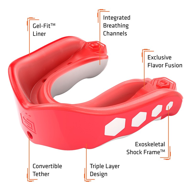 The Shock Doctor adult and youth Gel Max strapless mouthguard offers the protection you need for your sport. It's crafted using a heavy-duty rubber Exoskeletal Shock Frame and Gel-Fit Liner to provide maximum protection, fit and comfort. Note: Not recommended for individuals with braces