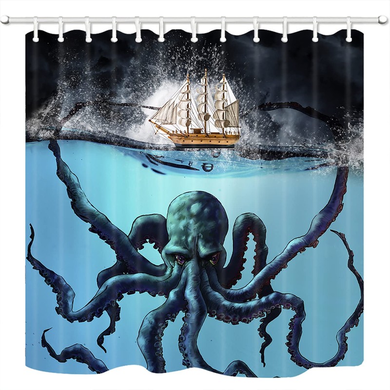 Shocur Black Nautical Octopus Shower Curtain, Funny Ocean Kraken Tentacles Attack Pirate Ship, 72 x 72 Inches Polyester Fabric Bathroom Cool Decor Set with 12 Hooks
