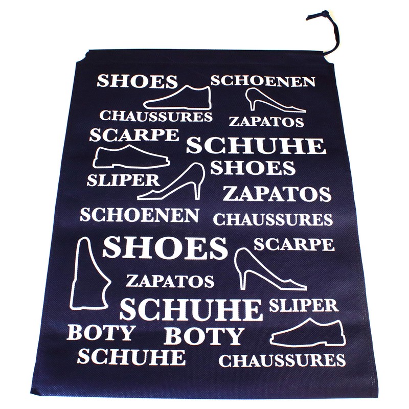 - Quality: Our shoe bag is made of high quality nylon and suitable for durable use. The base colour is a navy blue with white print. The durable fabric is breathable (not waterproof) to evaporate typical shoe odours and moisture. The bag can be securely closed using the threaded pull cord. So you gain in organising your shoes in drawers, shelves, suitcases or where you like to store shoes.