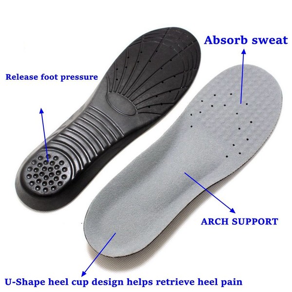 This insole fit for sports and protect the heel and base of the feet.Instant relief from painful with shock-absorb. Fit for flat feet,plantar fasciitis,heel pain,foot callus,foot corn,heel spur symptoms. Comfort and cushioning for all types of leisure or everyday footwear.Great for jogging,running,climbing,basketball,football,cycling,golf,tennis etc. Instruction for Use Remove the current insoles from your shoes. Place new insoles with your current insoles back to back. If your original insoles are shorter than the new insoles, you can trim along the outline on the bottom of the new insoles to match the size of your current insoles. Insert the new Insoles into your shoes (do not put both the new insoles and your current insoles in the shoes at the same time as it would be too thick and wide). **✔ (Black) High elastic Memory foam Material. ** **✔ (Yellow) Soft Memory foam Material. **Doctors highly recommend that you replace your insoles every 3 months to promote healthy feet.Tips Keep your shoes dry. Remove the original sole of the shoe before putting the soft insole. Put the insoles in a ventilating place to keep them dry and fresh. High temperature exposure is strictly prohibited.********