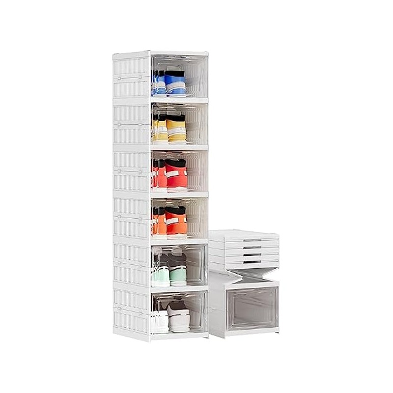 Shoe Storage Organizer Box 6-Tier Foldable Collapsible Stackable Shoe Rack Bins, Fit Size 12, No Assembly, for Men and Women