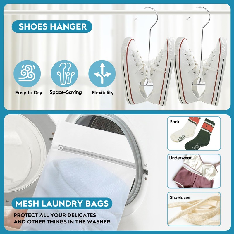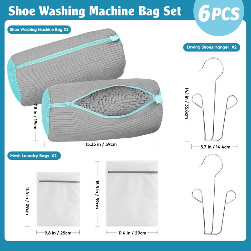 - ✔【Easy to clean shoes】With these practical shoes washing machine bag. Simply put shoes in the bag and put them in the washing machine - done! No more tedious hand scrubbing and dirty cleaning sessions. Set contains: 2 special shoe wash bags + 2 bonus laundry bags + 2 shoe hangers