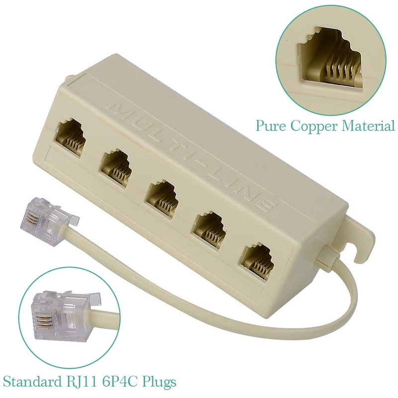 SHONCO Phone Line Adapter, Five-way Telephone Splitter,RJ11 6P4C Male-to-female 5-socket Port Telephone Line Cable Splitter and One In-line Coupler Connector,Beige