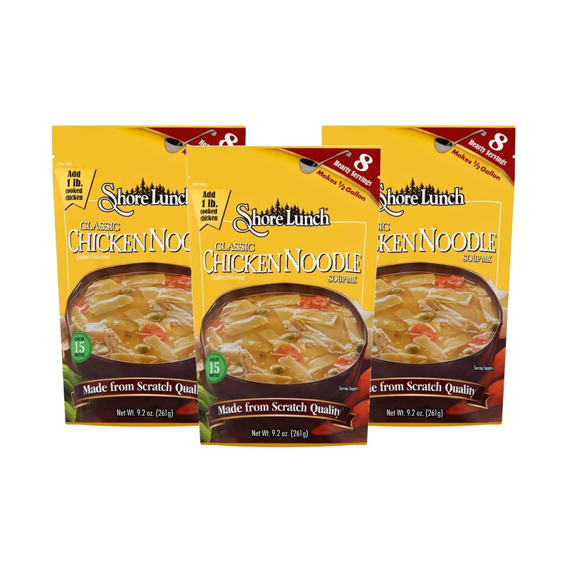 - Shore Lunch Classic Chicken Noodle Soup Mix is a chef-inspired medley of vegetables, noodles and select seasonings that cooks up fast and delicious