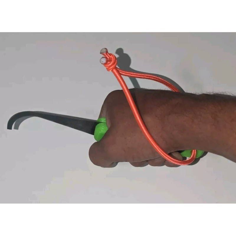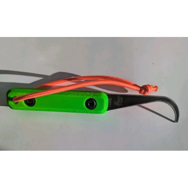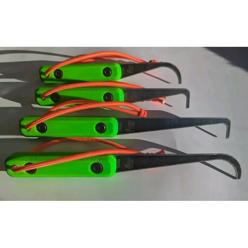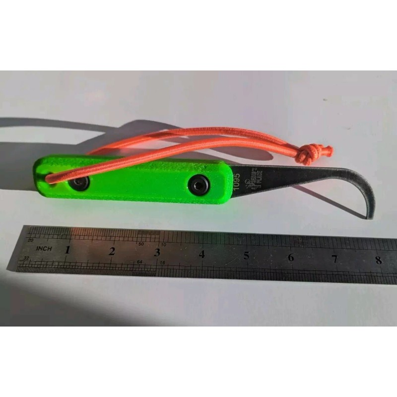 Curved tipped Gold mining, prospecting, dredging, digging, crevice and sniping scraper made for serious miners. Strong durable handle with stretchy wrist band containing an 1095 spring steel blade. 1095 is very tuff and flexible. Will last for years of scratching out cracks. Get the gold others missed with this high quality, thin long lasting tool.