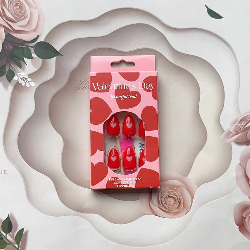 Package Include:24pcs Valentine's Day fake nails&24pcs nail double-side stickers&1pcs alcoholpad&1pcs wooden stick.