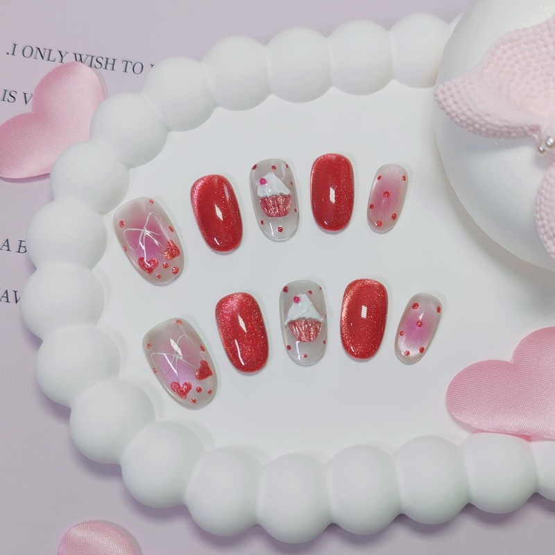 - DESIGNS: Our round oval stick on nails are all handmade by experienced and aesthetic nail artists. The press ons have hand-painted white french tip/star/bowknot/mermaid fishtail/flower/heart/polka dots/Hibiscus patterns on them, and with 3D cupcake/jelly pudding/golden stripes designs/rhinestone/pearls trim, glitter and sparkle cat eye/metallic/aurora surface, luxury, exquisite and unique