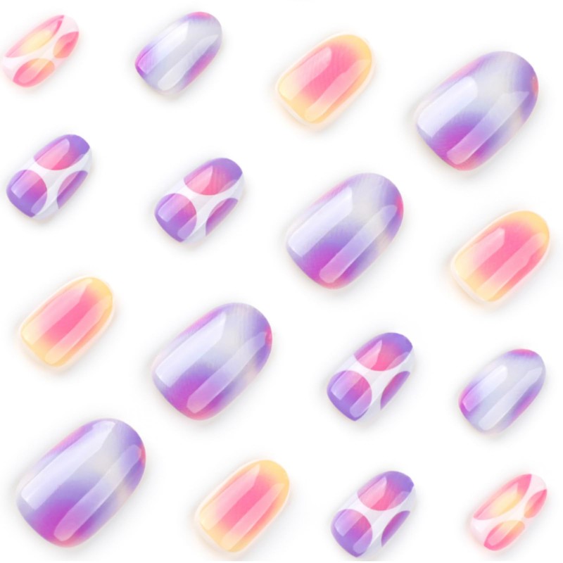 Short Oval False Nails - 24Pcs Colourful Smudges Designs Fake Nail - French Almond Purple & Pink Press on Nails with Glue - Full Cover Acrylic Reusable Stick on Nails for Women Nail Art Summer