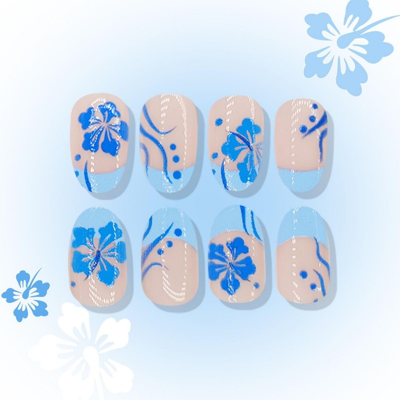Short Oval Press on Nails French Tip Blue Fake Nails Floral Nails Press on with Hibiscus Designs Summer Nails Glue on Cute Acrylic Nails for Women Girls 24Pcs