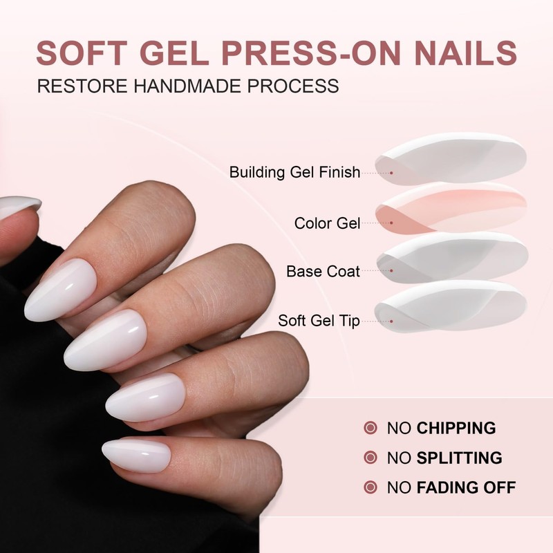 - 【How Natural They Are】 These press on nails are made of soft gel, making them both soft and flexible, putting zero pressure on your nail beds and making them feel like real nails. Designed to fit the nail beds perfectly, render a gentle flex and a beautiful cuticle line