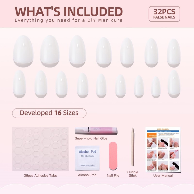 Product Included : 36pcs Adhesive Tabs 32 × Press on Nails 16Sizes 1 × Super-hold Nail Glue 1 × Cuticle Stick 1 × Nail File How to Use: 1:Remove the surface keratin by gently grinding the nail slices with a scrub, rinse and keep the nail clean and dry. 2:Select the right size of the nail and take the right amount of glue stickers or adhesive tape on the inside of the selected nail plate. 3:Attach a slice from the root of the nail to the front of the nail, hold down the nail for 8 seconds, stick it tightly. How to Remove: 1:Glue stick a piece:When the nail is removed, soak it directly in the remover or cover with aluminum foil, wait about 10 minutes, after the nail is softened, use a dead skin to gently pry the base of the nail and the sides. 2:Adhesive tape of adhesive tape:Nail polish remover is not necessary, use dead skin to remove the nail from both sides of nail. Tips: 1.Don't touch water for two hours after putting on the nails. 2.Because each display is different, the product may have color differences, please don't worry, this is a normal phenomenon. 3.If you have any questions, please contact us in time.Thank you for loving and choosing Seeneey fake nails. 4.Please note that due to differences in monitors, there may be slight variations in the displayed colors.