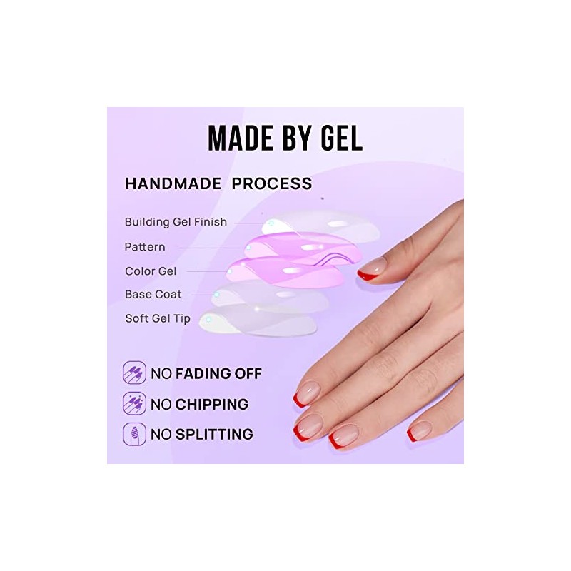 - Made by Gel: We made these french tip press on nails completely follow the handmade process(base coat, color gel, pattern, top coat). The color and patterns are made by gel polish instead of printed by ink. Get salon-like nails in 5 mins!