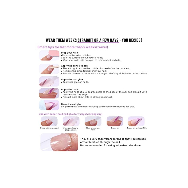 - Wear Them Weeks Straight or A Few Days - You Decide!If you want to get more than 14 days long lasting, we recommend using nail glue and adhesive tabs together. If you want to change the design weekly, only using glue is best choice. Adhesive tab is best for a date night or a little event.